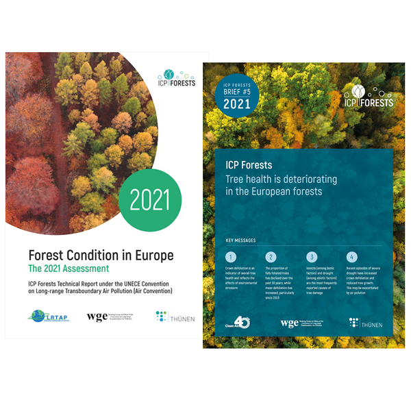 ICP Forests beobachtet die europäischen Wälder seit den späten 1980er Jahren. Im ICP Forests Brief No. 5 "Tree health is deteriorating in the European forests" werden die zeitlichen und räumlichen Entwicklungen der Kronenverlichtung von Bäumen beschrieben, einem weit verbreiteten Indikator für den Zustand des Waldes. Danach ist der Anteil der voll belaubten Bäume in den letzten 30 Jahren zurückgegangen, während die durchschnittliche Kronenverlichtung zugenommen hat, insbesondere seit 2010. Insekten (unter den biotischen Faktoren) und Trockenheit (unter den abiotischen Faktoren) sind die am häufigsten gemeldeten Ursachen für Baumschäden.