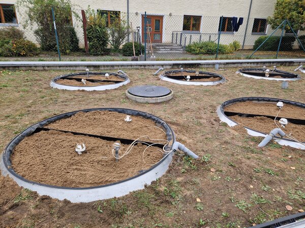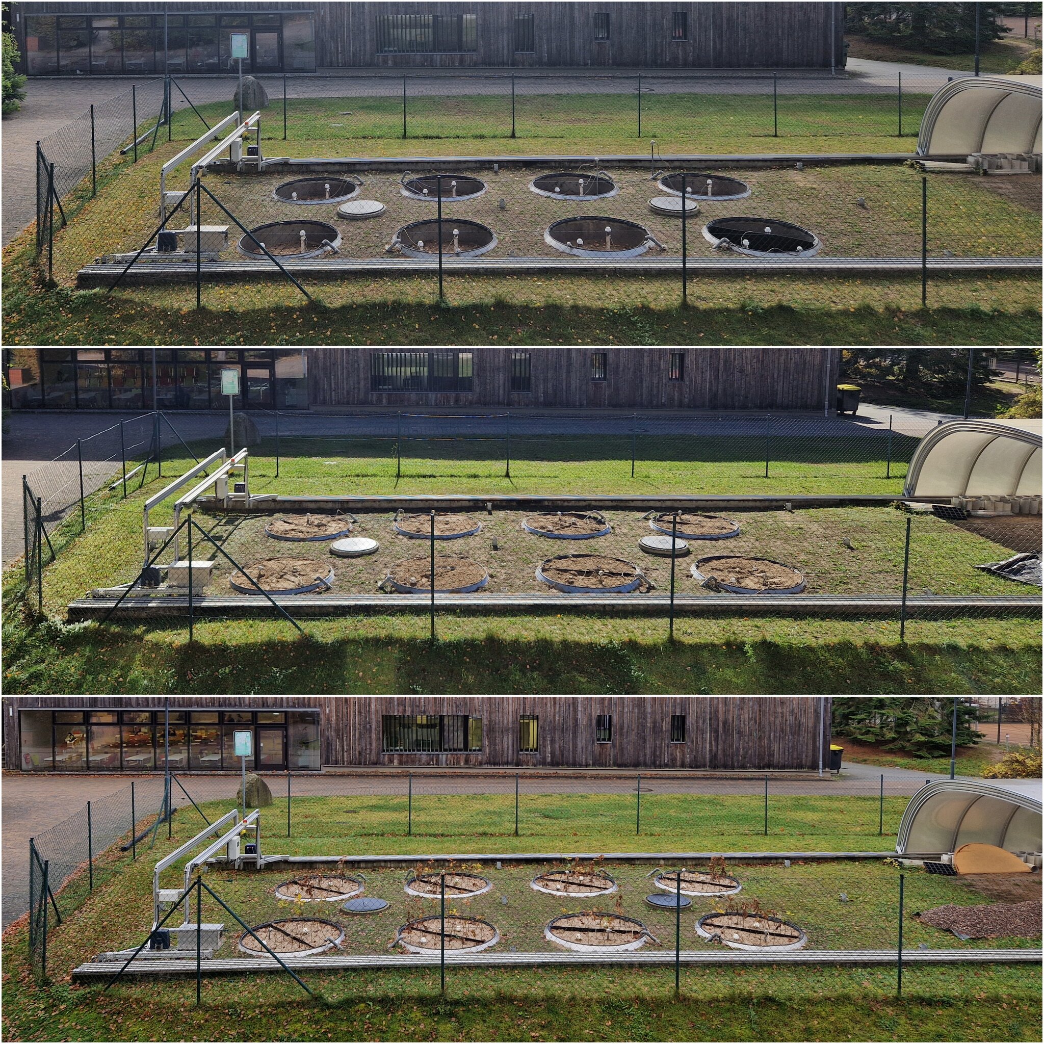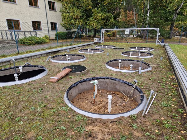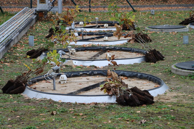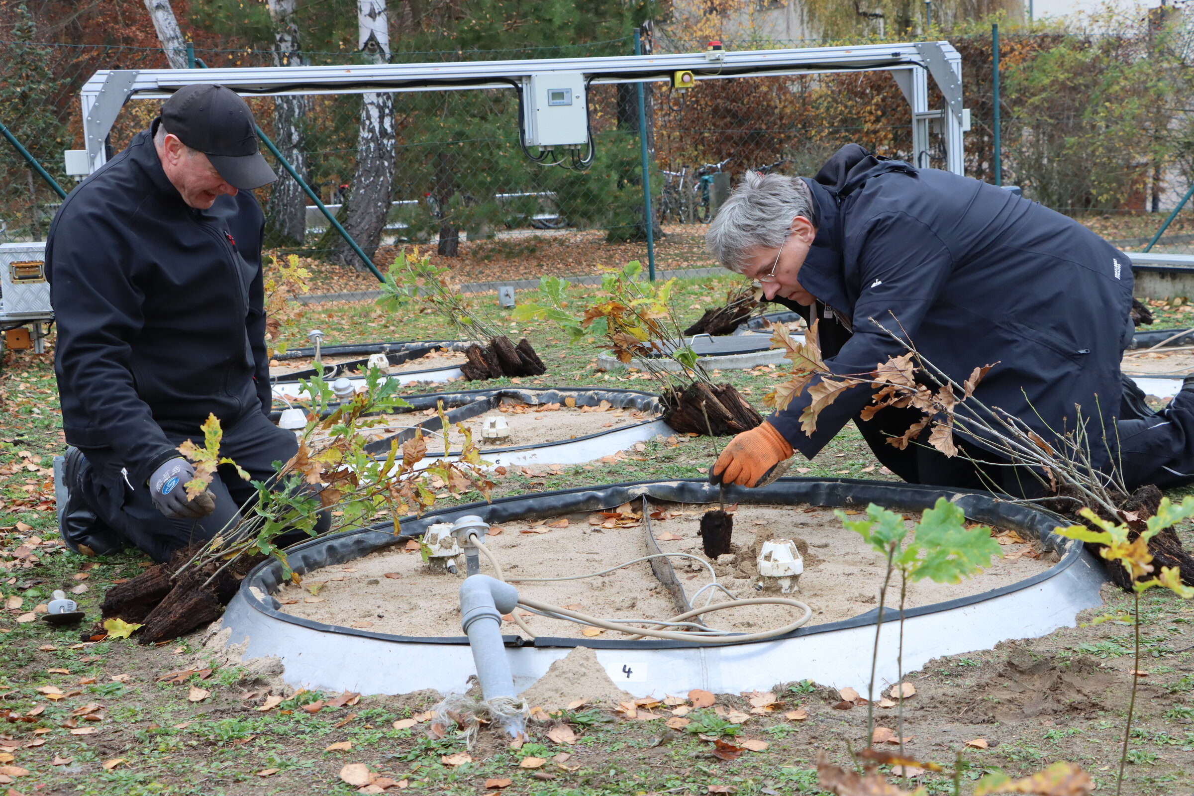 Um den jungen Bäumchen gute und vor allem gleiche Startbedingungen zu ermöglichen, wurde zuvor der Oberboden in den acht Lysimetern komplett ausgetauscht und mit frischem Sand bestückt. Sand eignet sich für den Trockenstressversuch besonders gut, weil er als armer Boden nicht viel Wasser halten kann und sich die Pflanzen dadurch besonders gut stressen lassen.
