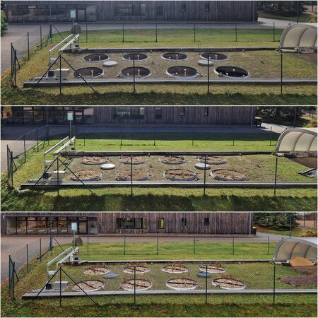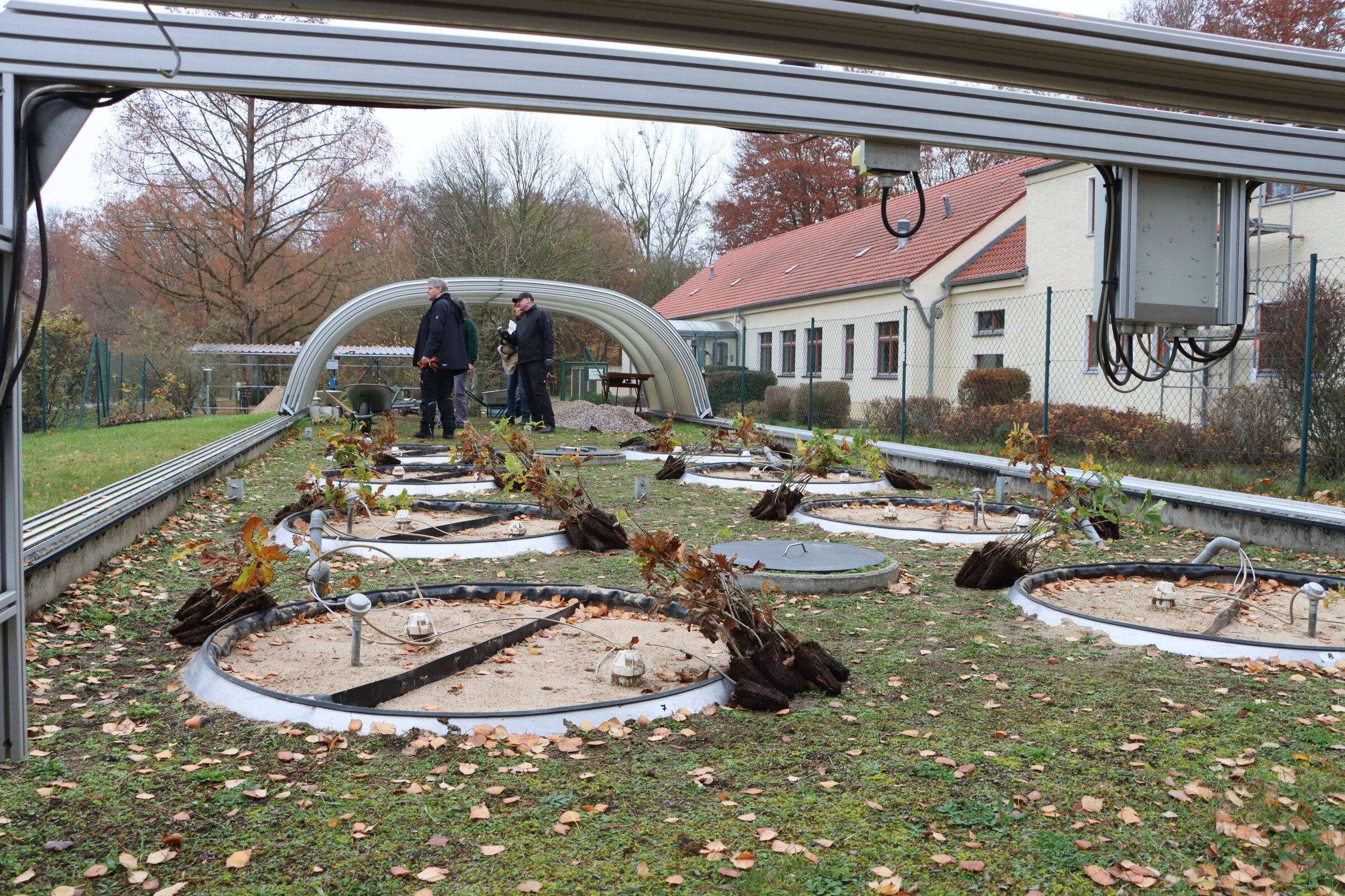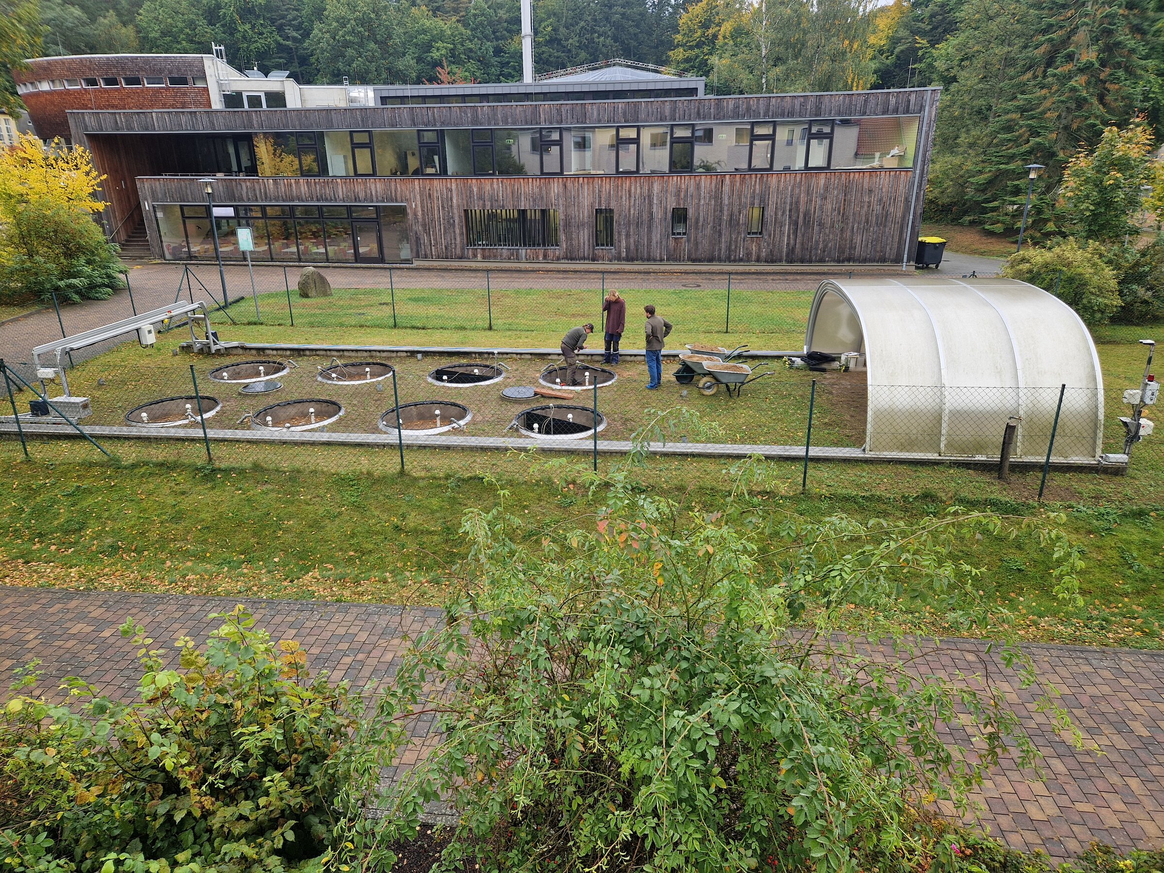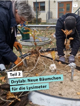 Die Eicheln wurden letzten Winter gesammelt und am Thünen-Institut für Forstgenetik in Großhansdorf ausgesät und eine Vegetationsperiode lang gehegt und gepflegt. Im November 2025 sind die Pflanzen nach Eberswalde ans Thünen-Institut für Waldökosysteme umgezogen. Sie wurden jetzt im Herbst gepflanzt, um den Pflanzstress gering zu halten. Bis zum Frühjahr werden sie nun unter optimalen Bedingungen gehalten, damit sie gut anwachsen können. Im Frühjahr 2026 beginnt dann die Austrocknung. Das Dach des Drylabs lässt sich bei Regen automatisch zufahren. So können die Pflanzen in den Lysimetern vom Regen abgeschirmt und trockengestresst werden. Die Kontrollbäume werden hingegen weiter bewässert. An den Bäumen werden dann zahlreiche Parameter gemessen. Anhand von Merkmalen wie der Anzahl der Blätter oder der Größe der Sprösslinge können wir bereits erste Schlüsse ziehen, wie die Herkunft der Samen die Resilienz der Bäume gegenüber Trockenheit beeinflusst. Es wird weiterhin beobachtet, welche Bäume als erste unter der Trockenheit leiden, eventuell sogar absterben. Da es durchaus vorkommen kann, dass sich die jungen Pflanzen trotz Trockenstress in der nächsten Vegetationsperiode im Frühjahr nochmal erholen, geht das Experiment bis 2027.