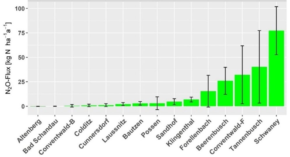 Die Laboruntersuchungen zur Bodenentgasung führen einzig für die Behandlungsmethode 20 °C und 90 % WFPS bei gestörten Proben zu signifikanten N2O-Emissionen (Abb. 1). Hier zeigte der NO3-Gehalt im Boden einen signifikant positiven Einfluss auf die N2O-Emissionen. Das wird vor allem an den Standorten Conventwald (32,15 ± 29,65 kg N ha-1a-1) im Schwarzwald nahe Frankreich sowie Tannenbusch (40,32 ± 37,09 kg N ha-1a-1) und Schwaney (77,29 ± 24,50 kg N ha-1a-1) (20-90-G) in Nordrhein-Westfalen nahe den agrarintensiven Regionen in den Niederlanden deutlich (Abbildung 1). Die Emissionen der gestörten Proben können als maximales Potential der Emissionen angesehen werden. Bei Verwendung ungestörter Proben, wie sie natürlich vorkommen, liegen die N2O-Emissionen bei unter 1 kg N ha-1a-1.