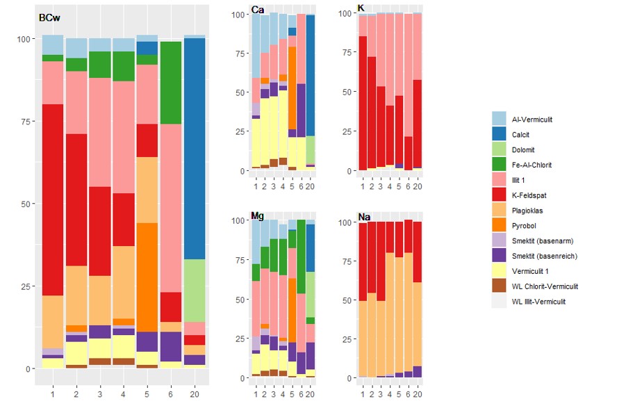 Für die Böden der Verwitterungsklassen 1 bis 4 und 6 stellen K-Feldspat, Plagioklas und Illit den größten Teil der Minerale (67-83 %) bei der Verwitterungsrate (Abbildung 2). Dabei steigt der Anteil an Illits mit zunehmender Verwitterungsklasse an, während der Anteil des K-Feldspats abnimmt. In Böden der Verwitterungsklasse 5 machen Pyrobole und in der Verwitterungsrate 20 Calcit und Dolomit den höchsten Anteil der Minerale an der Verwitterungsrate aus.
