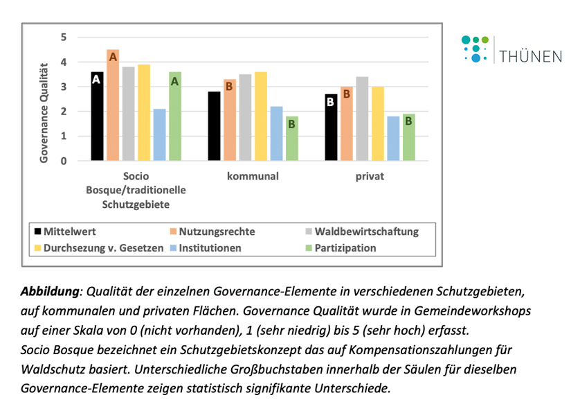 Für Ecuador konnten statistische Zusammenhänge zwischen hoher Partizipation und gesicherten Nutzungsrechten auf der einen und verminderter Entwaldung auf der anderen Seite gezeigt werden. Direkte Treiber der Entwaldung wie landwirtschaftliche Landnutzung, Infrastruktur und sozioökonomische Faktoren hatten allerdings statistisch stärkeren Einfluss und müssen vordringlich beachtet werden. Die mittlere Governance in sog. Socio Bosque und indigenen Schutzgebieten war höher als für Gemeinde – oder Privatflächen (siehe Abbildung); die Entwaldungsraten waren dort niedriger. Das zeigt, dass unter stabiler Governance Kompensationszahlungen für Waldschutz funktionieren können und dass es sich lohnen kann, traditionelle Schutzgebiete zu unterstützen.