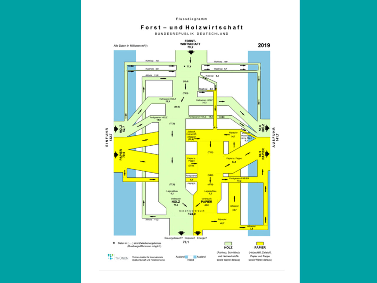 Der rechnerische Inlandsverbrauch steigt 2020 gegenüber 2019 um 1,5 % an auf 125,8 million m³(r). Im Jahr 2021 berechnet sich ein Rückgang um 0,7 % auf 124,9 Mio. m³(r). Im Jahr 2020 entfallen 62,5 % des Inlandsverbrauchs auf Holzprodukte und 37,5 % auf Papierprodukte.