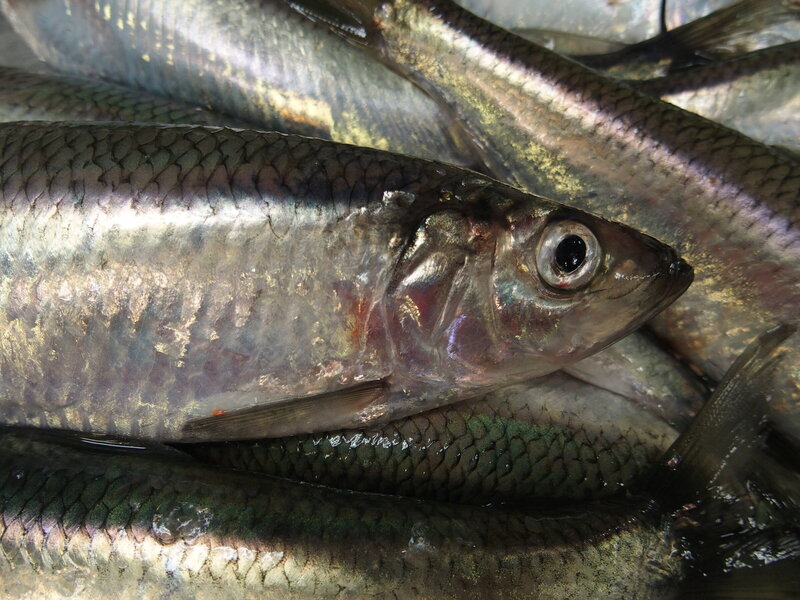 Eine Nahaufnahme eines Herings, der auf anderen Heringen liegt.