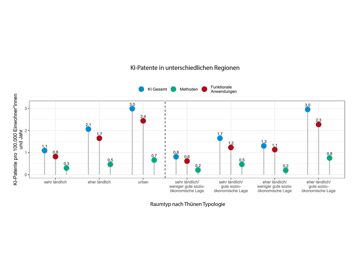 Neue Technologien entstehen und verbreiten sich hauptsächlich in urbanen Räumen, ländliche Räume sind eher Nachzügler. Wissen fließt dabei entlang globaler Netzwerke, die große urbane Zentren miteinander verbinden. Findet eine neue Technologie oder neues Wissen in diesen Zentren Anwendung, verteilt es sich anschließend in die geographisch umliegenden ländlicheren Räume. Dies dürfte auch für Künstliche Intelligenz (KI) gelten. Die Patentanmeldungen sind dementsprechend in Städten höher als auf dem Land. Dennoch gibt es auch ländliche Regionen, die eine hohe Patentintensität haben.
