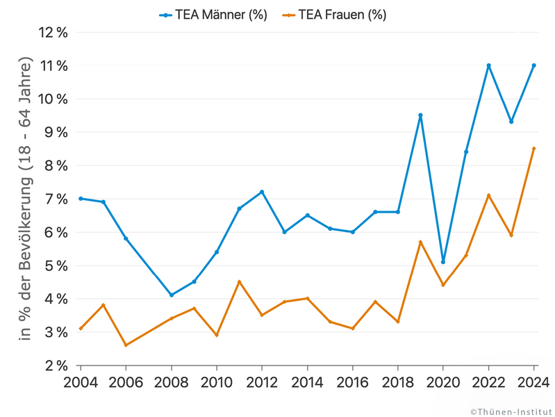 Gesine Tuitjer und Christian Bergholz vom Thünen-Institut für Innovation und Wertschöpfung in ländlichen Räumen sind Mitautor*innen des Sonderberichts und haben die Stadt-Land-Unterschiede im Gründungsverhalten der Frauen analysiert. Ihr Ergebnis: Auf dem Land gründen Frauen seltener Unternehmen als in Städten. So entschieden sich im vergangenen Jahr 4,3 Prozent der befragten Frauen in ländlichen Räumen dafür, ein eigenes Unternehmen zu gründen. In Städten waren es 5,4 Prozent.