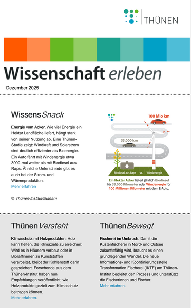Seit April 2025 gibt es den Newsletter „Wissenschaft erleben“ des Thünen-Instituts. Der Newsletter erscheint alle zwei Monate und wird per E-Mail versandt.