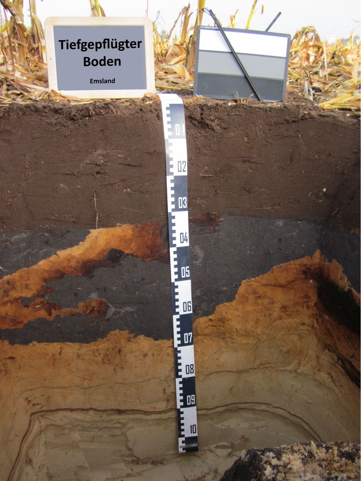 Bodenprofil eines 70 cm tief gepflügten Ackerbodens im Emsland (© Thünen-Institut)