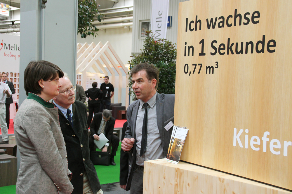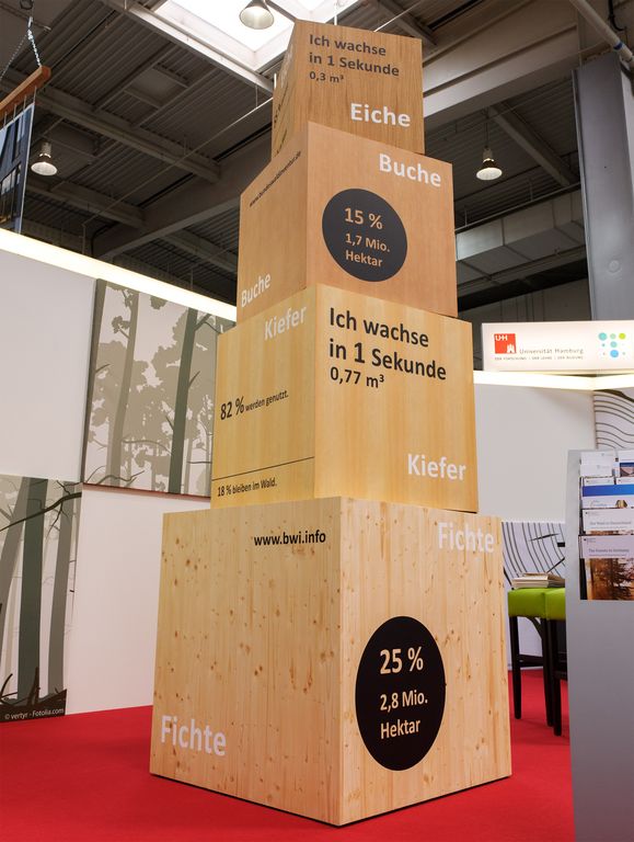 In diesem Jahr präsentieren wir gleich zwei Forschungs-Highlights: Zum einen stellen wir die Ergebnisse der dritten Bundeswaldinventur vor, die unter der Leitung des Thünen-Instituts für Waldökosysteme erstellt wurde. Die Ergebnisse zeigen, dass in Deutschland mehr Holz nachwächst als genutzt wird und dass kein europäisches Land so viel Wald hat wie Deutschland. Ein fast vier Meter hoher, gestapelter Zuwachswürfelturm zeigt auf der Messe den beeindruckenden Zuwachs pro Sekunde der vier wichtigsten deutschen Baumarten.