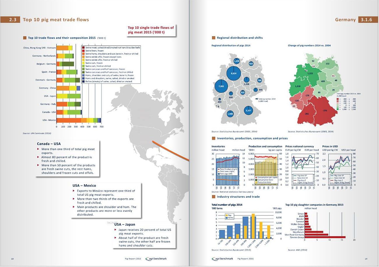 Alleinstellungsmerkmal des Reports ist die Auswertung der Daten, die aus den typischen Betrieben des Netzwerks sowohl getrennt für die Sauenhaltung und die Schweinemast als auch für geschlossene Systeme mit Sauenhaltung und Schweinemast gewonnen werden konnten. Dazu gehören einerseits produktionstechnische Kennziffern wie Ferkelanzahl und -gewichte, Mortalitäten, tägliche Zunahmen und Mastdauer, andererseits auch betriebswirtschaftliche Ergebnisse wie Vollkostenrechnungen, Preisanalysen sowie Rentabilitätskennzahlen. So wird es möglich, die Unterschiede in der Wirtschaftlichkeit der Schweineproduktion in verschiedenen Ländern zu verstehen und die Konsequenzen geänderter Rahmenbedingungen für die Betriebe aufzuzeigen.