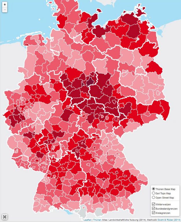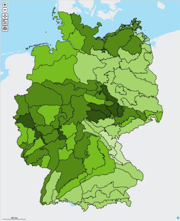 Seit gut einem Jahr macht das Thünen-Institut Daten zur Landnutzung und Tierhaltung in Deutschland bis auf Gemeindeebene in digitalen Kartensätzen öffentlich zugänglich. Auf der Seite thuenen-atlas.de können Internetnutzer sich nach unterschiedlichen Anbaukulturen oder Tierarten aufgeschlüsselt den räumlich hochaufgelösten Datensatz anzeigen lassen, der auf einer am Thünen-Institut entwickelten Schätzmethode beruht. Nun ist der Thünen-Atlas zur landwirtschaftlichen Nutzung um Karten zu Wäldern und Waldnutzung erweitert worden.
