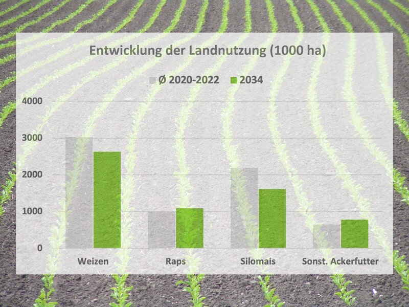 Bis 2034 wird weniger Getreide angebaut. Zurückgeführt werden kann das auf veränderte Preiserelationen sowie weniger landwirtschaftlich genutzte Fläche. Dagegen wird der Anbau von Ölsaaten bis zum Jahr 2034 ausgedehnt.