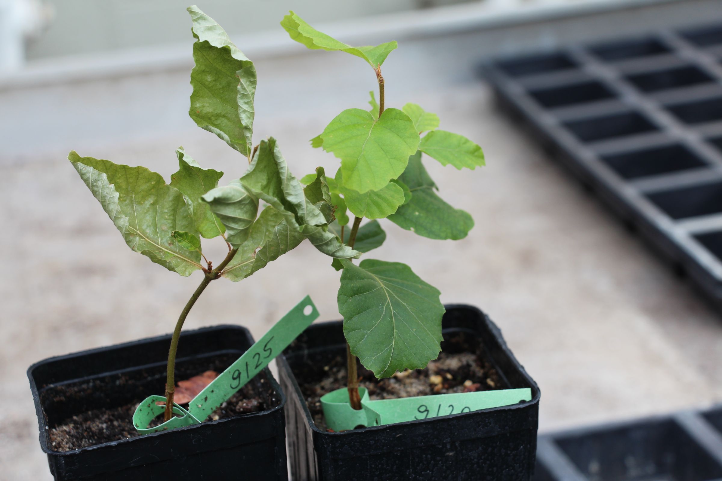 Zwei kleine Blumentöpfe mit jungen Buchenpflanzen stehen auf einem Tisch. Eine Pflanze hat vertrocknete eingerollte Blätter, die andere hat frische grüne Blätter.