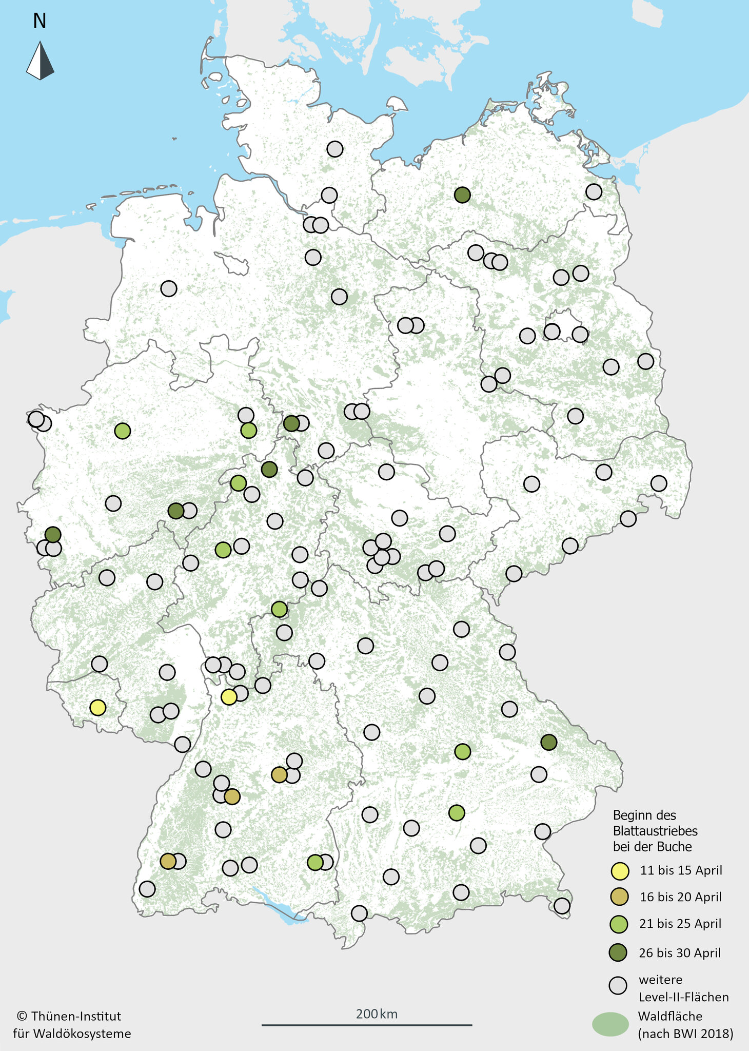 Im langjährigen Durchschnitt beginnt der Austrieb der Rotbuche um den 26. April. Doch regional und selbst zwischen einzelnen Bäumen gibt es große Unterschiede: Im Süden treiben die Buchen früher aus als im Norden. Auch die Höhenlage und die Art und Stärke, wie Bäume den Wettereinflüssen ausgesetzt sind, beeinflussen den Zeitpunkt. Der früheste Austrieb auf den Flächen des Level-II-Monitorings wurde 2017 am 27. März im Steigerwald in Bayern dokumentiert. Die spätesten Austriebe fanden 1998 im Bayerischen Wald und 2010 in Esslingen bei Stuttgart statt – jeweils am 26. Mai.