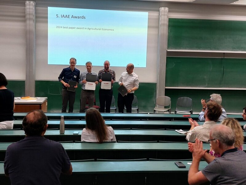 Die Gesellschaft hat zudem ihren Preis für die beste Dissertation verliehen. Dieser ging an Jonas Schmitt, der über die Reduzierung wetterbedingter Ernteverluste durch ein breiteres Spektrum angebauter Feldfrüchte promoviert hat – und welche Rolle Versicherungen dabei spielen. Für das daraus resultierende Paper, veröffentlicht 2024 in Agricultural Economics, erhielten er und seine Co-Autoren Frank Offermann, Andreia Ribeiro und Robert Finger zudem von der EAAE den Preis für das beste Paper.