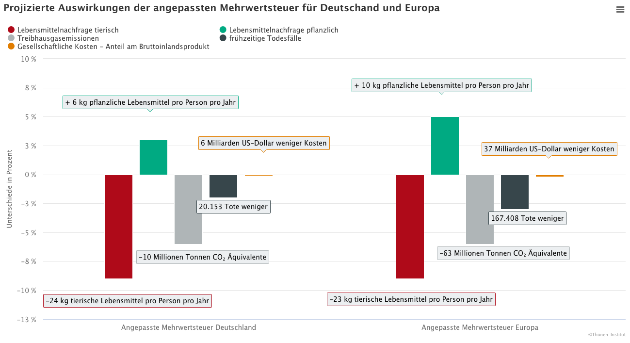 Am meisten Erfolg verspricht, die Mehrwertsteuer auf pflanzliche Produkte zu verringern und gleichzeitig die Mehrwertsteuer auf tierische Produkte zu erhöhen. Die projizierten Folgen für Europa: Die Umweltauswirkungen würden um sechs Prozent sinken, beispielsweise würde Deutschland etwa zehn Millionen Tonnen weniger Kohlendioxid ausstoßen. Das entspricht ungefähr den jährlichen Emissionen Lettlands. Außerdem gäbe es 330 ernährungsbedingte Todesfälle weniger pro eine Million Menschen. In Deutschland wären es 20.000 Todesfälle weniger. Die Steuereinnahmen würden um 45,6 Milliarden US-Dollar steigen, in Deutschland etwa um sieben Milliarden US-Dollar. Die Kosten für die Gesellschaft durch Krankheiten und Klimaschäden würden um 37,3 Milliarden US-Dollar sinken, in Deutschland um etwa sechs Milliarden US-Dollar. „Um Zielkonflikte zwischen Ökonomie, Umwelt und Gesundheit zu minimieren, sollte nach Möglichkeit die Mehrwertsteuer auf beide Produktgruppen angepasst werden.“, sagt Dr. Florian Freund.