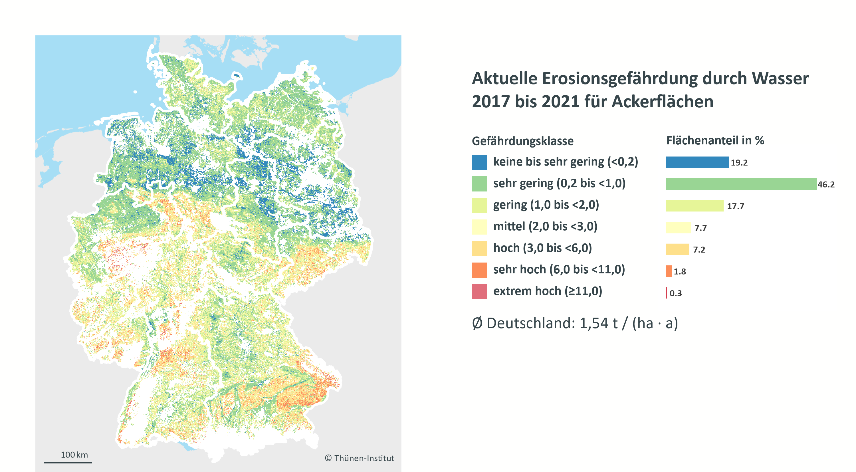 Die obenstehende Karte zeigt die Erosionsgefährdung gegenüber Wassererosion nach der Allgemeinen Bodenabtragsgleichung (ABAG). Die hier gezeigte Modellierung berücksichtigt neben Bodeneigenschaften, Topographie und Schlaggestaltung die Höhe, Intensität und den Zeitpunkt von Niederschlägen und die angebauten Ackerkulturen im Zeitraum 2017 bis 2021. Die Ergebnisse beruhen auch auf im Thünen-Institut generierten Informationen: Die Bodeneigenschaften integrieren Ergebnisse der Bodenzustandserhebung Landwirtschaft. Die Informationen zu Ackerkulturen wurden vom Team der Thünen-Fernerkundung aus Erdbeobachtungsdaten abgeleitet.