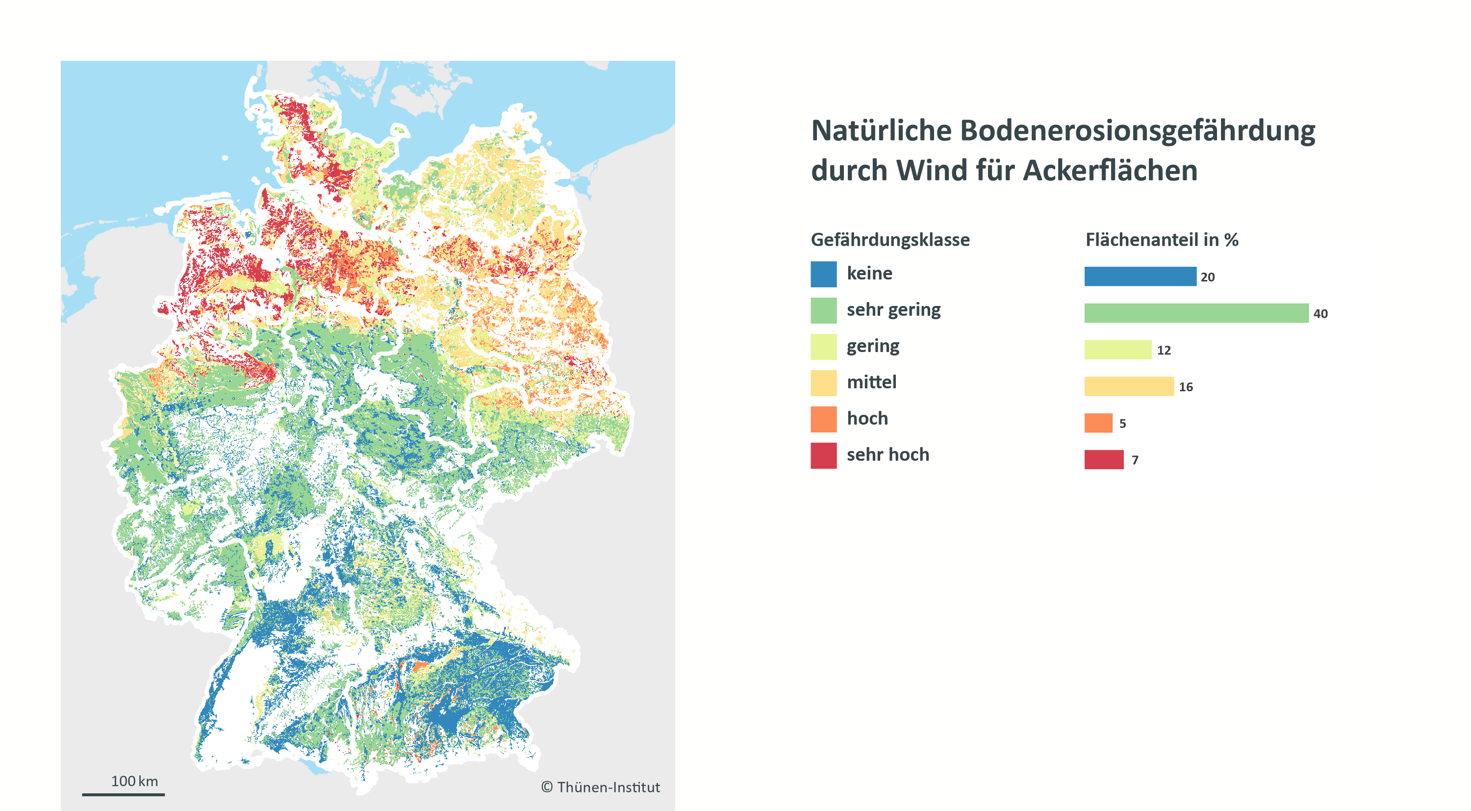 Auch für die Winderosion liegt eine deutschlandweite Gefährdungsabschätzung vor. Die untenstehende Karte zeigt eine qualitative Einstufung der natürlichen Erosionsgefährdung durch Wind. Diese beruht auf den Eigenschaften des Bodens und der mittleren Windgeschwindigkeit.
