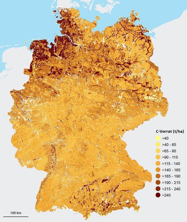 (...) Die deutlich größten Vorräte an organischem Kohlenstoff weisen mit 181 Tonnen Böden unter Dauergrünland auf, gefolgt von Waldböden mit 100 Tonnen und knapp dahinter Ackerböden mit 95 Tonnen. Der hohe Vorrat an organischem Kohlenstoff in landwirtschaftlich genutzten Böden ist hauptsächlich auf die Tiefgründigkeit der Böden und die vielen grundwasserbeeinflussten Böden mit sehr hohen Kohlenstoffvorräten (z. B. Moorböden und moorähnliche Böden) zurückzuführen.