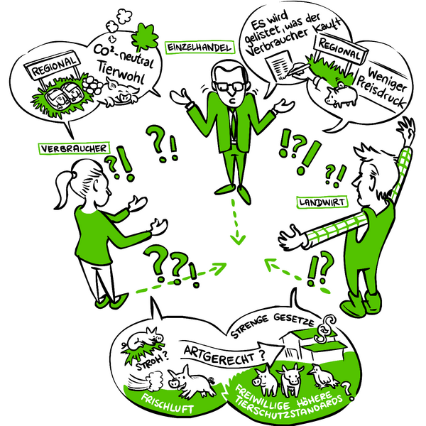 - Aufzeigen von realistischen Wegen, wie die landwirtschaftliche Tierhaltung aus Sicht der unterschiedlichen gesellschaftlichen Gruppen verbessert werden kann. Wie können die Kritikpunkte langfristig reduziert werden?