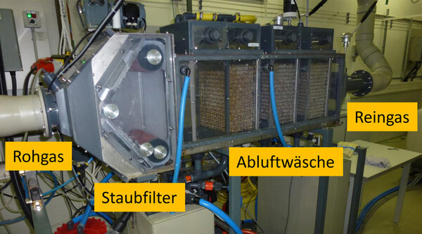 Ziel der Arbeiten mit verschiedenen Versuchsanlagen (Bild 2) unter Praxisbedingungen ist es daher, eine effektive Staubvorabscheidung, eine weitgehende Ammoniakabscheidung und einen verbesserten Geruchsstoffabbau zu wirtschaftlich vertretbaren Kosten zu entwickeln.