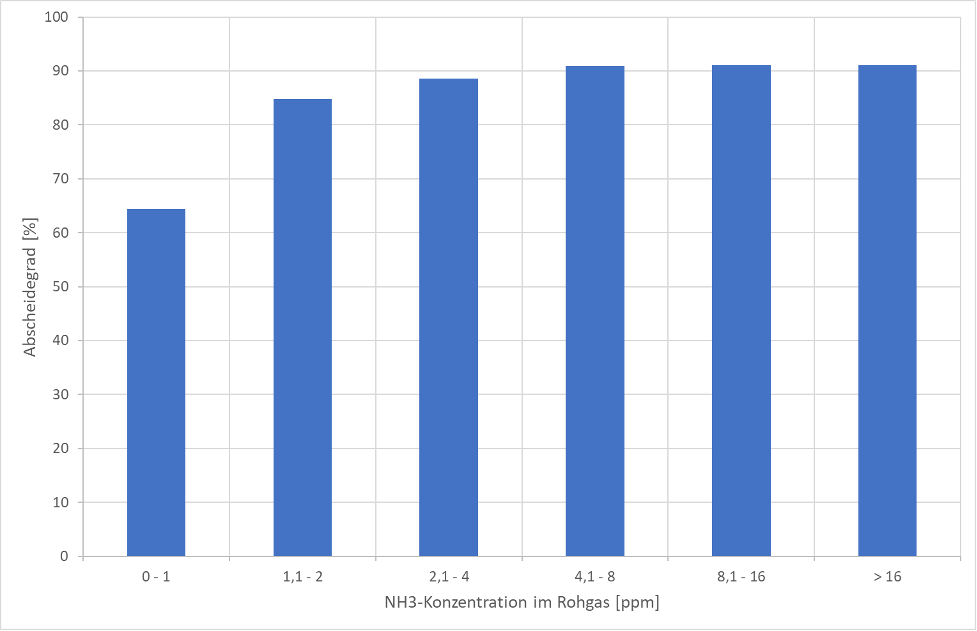 Bild 3 zeigt die Wirksamkeit der Ammoniakabscheidung, die mit einer 2-stufigen schwefelsauren Abluftwäsche in Abhängigkeit der Rohgaskonzentration gewährleistet werden kann.