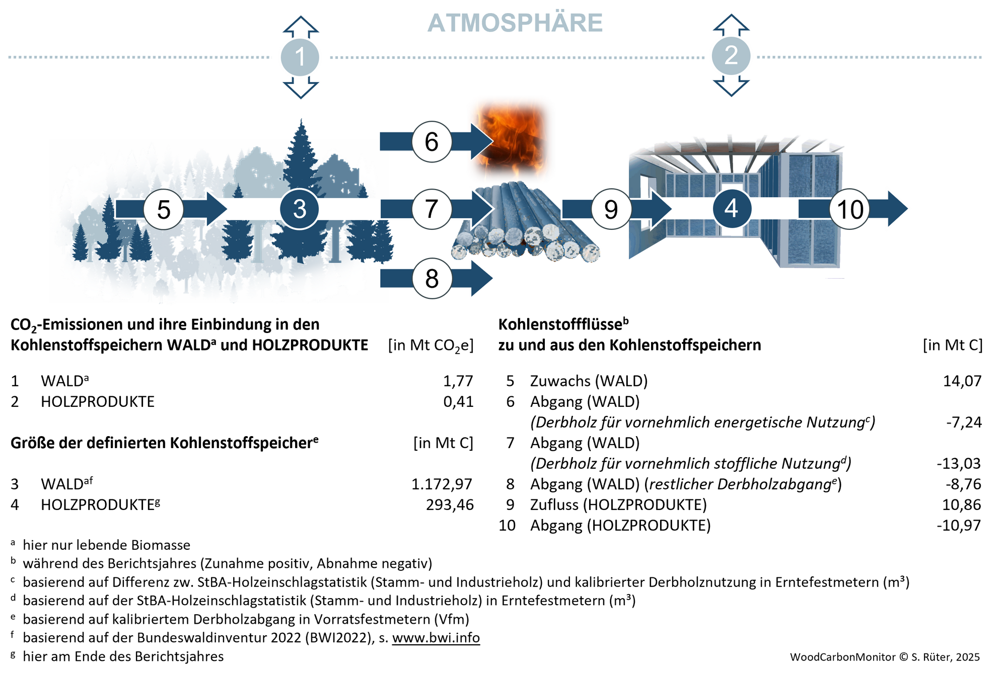 In den Jahren 2018 bis 2022 führten die ausgeprägte Trockenheit sowie die daraus resultierenden Waldschäden zu einer verstärkten Nutzung des heimischen Rohholzes. Mehr Holz wurde zu Holzhalbwaren weiterverarbeitet. Dadurch wurde auch mehr Kohlenstoff im sogenannten Holzproduktespeicher gebunden. Seit 2023 sind die Waldschäden jedoch weitestgehend aufgearbeitet. Dementsprechend entwickelt sich auch die Einbindung des Kohlenstoffs im Holzproduktespeicher zurück. Dies führte 2024 zusammen mit den Abgängen aus dem Speicher zum Verlust der Senkenfunktion der Kategorie Holzprodukte.