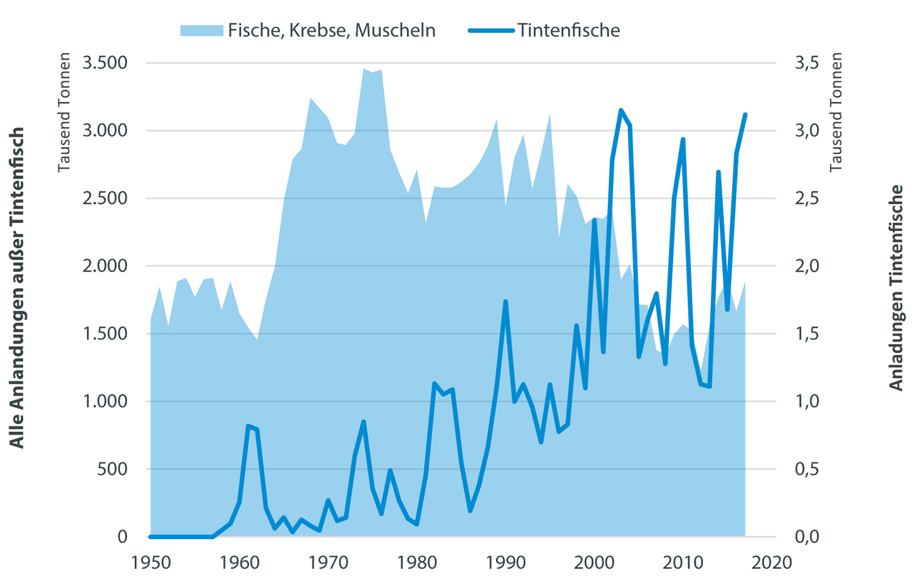 Offizielle Meldungen aus der Fischerei dokumentieren für die Nordsee einen etwa dreifachen Anstieg der Tintenfischanlandungen in den letzten 40 Jahren. Zwar stellen sie hier im Vergleich zu den Fischen nur einen kleinen Teil der gezielt gefangenen Ressourcen, aber ihre Anlandungen erreichen inzwischen bis zu 3.000 Tonnen jährlich.