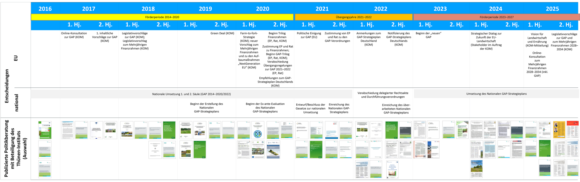 Auch in die Reformprozesse zur GAP nach 2013 hatten sich Wissenschaftlerinnen und Wissenschaftler des Thünen-Instituts in allen Stufen des Politikzyklus mit Stellungnahmen und Studien beratend in die politischen Diskussionen eingebracht. Diese bezogen sich auf grundsätzliche Überlegungen der Europäischen Kommission im Vorfeld ihrer Mitteilung „Die GAP bis 2020: Nahrungsmittel, natürliche Ressourcen und ländliche Gebiete – die künftigen Herausforderungen“ von November 2010, auf die in der Mitteilung skizzierten Politikoptionen, auf die Legislativvorschläge der Kommission von Oktober 2011 und die endgültigen Reformbeschlüsse auf europäischer Ebenen Ende 2013/Anfang 2014 sowie auf die Beschlüsse zur nationalen Umsetzung in Deutschland im Jahr 2014.
