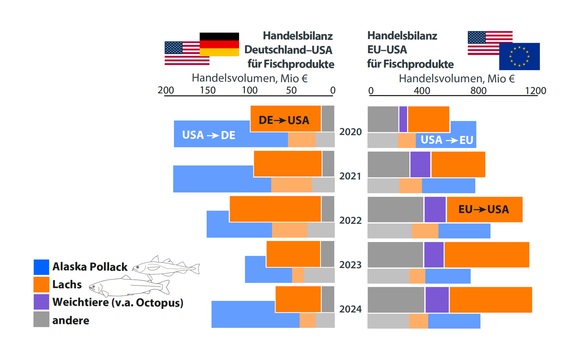 Die Handelsbilanz für Fischereiprodukte mit Deutschland betrug zwischen 2020 und 2024 insgesamt 316 Millionen Euro zugunsten der USA, mit der EU dagegen 933 Millionen Euro zugunsten der EU.