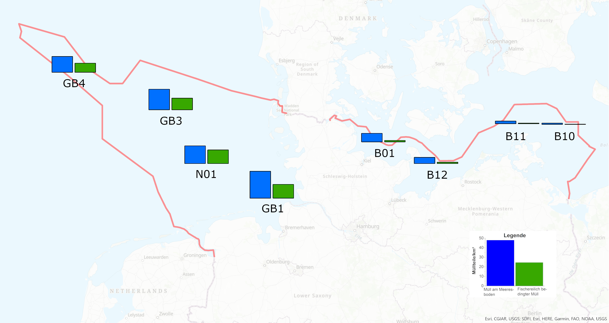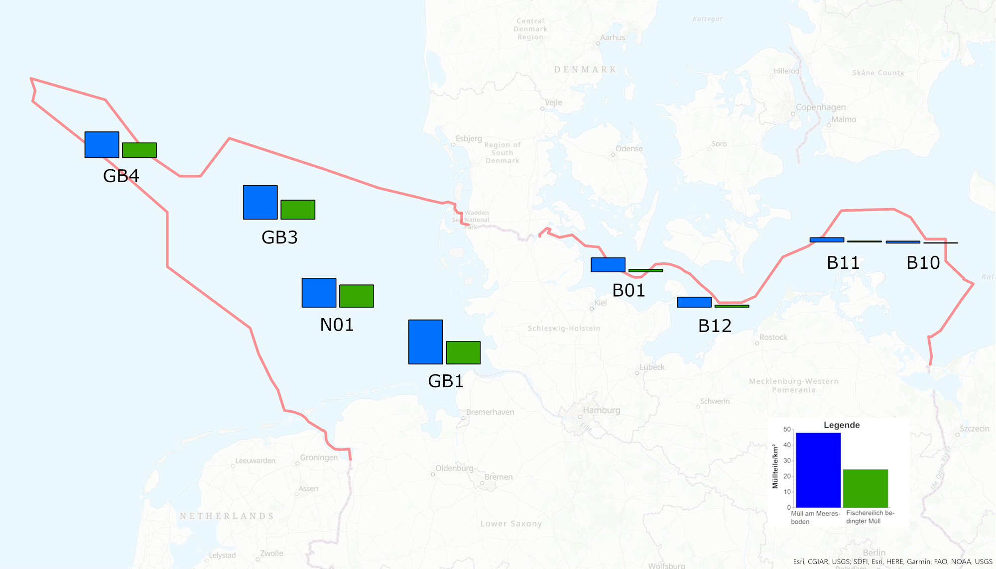 Die regionalen Unterschiede in der Kontamination mit Müll am Meeresboden an den einzelnen Stationen der Forschungsausfahrten werden in der Karte deutlich. Die höchsten Mittelwerte treten in der Nordsee-AWZ auf der östlichen, küstennahen Station GB1 auf. Der Meeresboden in der Ostsee ist an der westlichsten Station B01 am höchsten mit Müll belastet. Neben der Menge unterscheidet sich auch die Zusammensetzung des Mülls regional. Neben dem dominierenden Material Plastik werden geringere Anteile von Müll aus Metall, Gummi, Glas oder Naturstoffen gefunden. Auch die Zusammensetzung des Plastikmülls in den Bereichen der AWZ von Nord- und Ostsee unterscheidet sich deutlich: Während in der Nordsee Fischereileinen, Monofilamente und Plastikfolien besonders häufig vorkommen, sind es am Boden der Ostsee synthetische Seile, Plastikfolien und Plastiktüten.