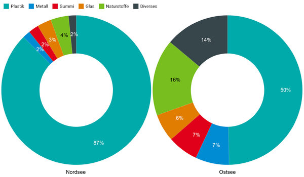 In beiden Meeresgebieten dominiert Plastik die Zusammensetzung des Mülls. In der AWZ in der Nordsee beträgt der Plastikanteil im Müll am Meeresgrund 87 %, in der AWZ in der Ostsee sind es 50 %. Der Anteil Müll aus der Fischerei ist in der Nordsee mit ca. 60 % deutlich höher als in der Ostsee mit nur ca. 20 %. Beim Vergleich zwischen Nord- und Ostsee muss allerdings beachtet werden, dass in den beiden Meeren mit unterschiedlichen Netzen gefischt wurde.