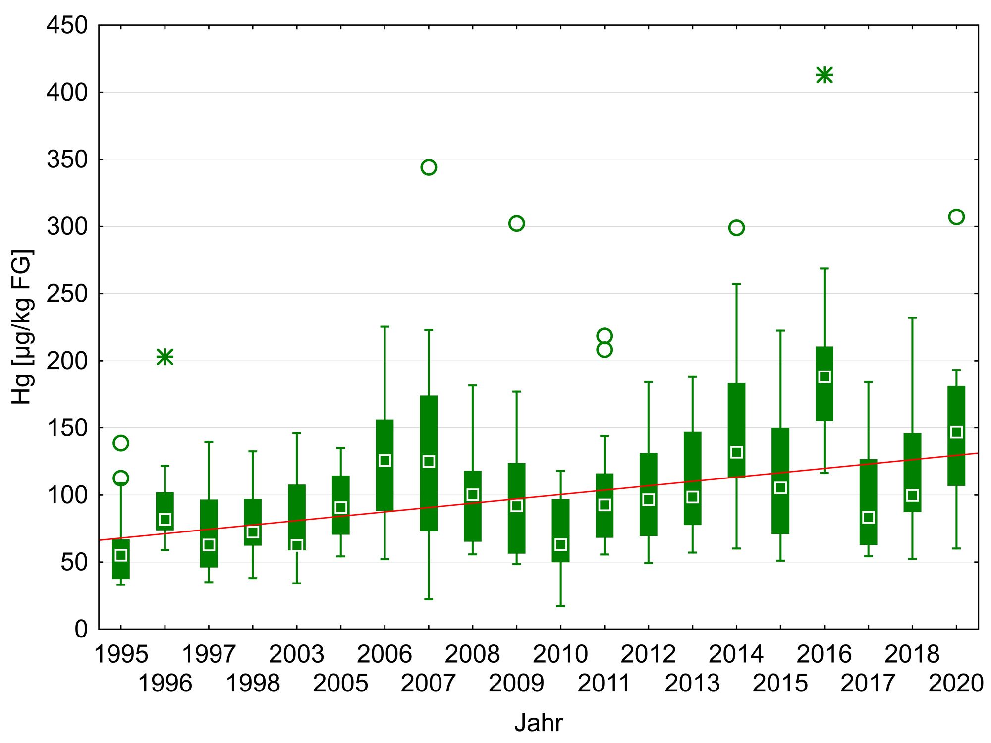 Wird die Hg-Konzentration in Klieschen aus der inneren Deutschen Bucht (N01, Abb. 2) betrachtet, so kann man einen ansteigenden zeitlichen Trend in der Hg-Belastung der letzten 25 Jahre erkennen (Abb. 3). Dieser signifikante Trend ist nicht durch Effekte wie Bioakkumulation zu erklären und spiegelt sich auch nicht in den Hg-Konzentrationen des Sediments wider.