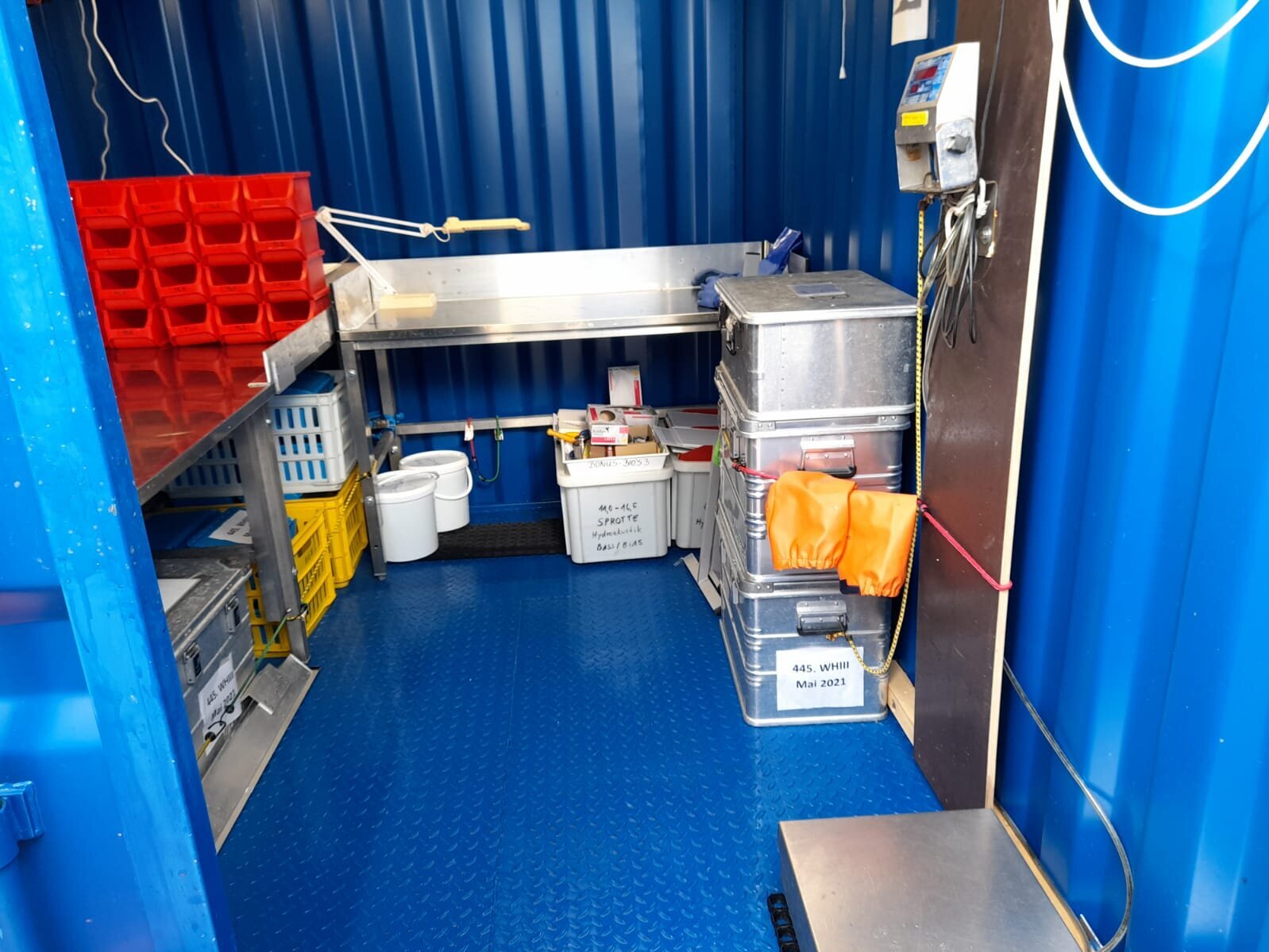 Der dritte Punkt betraf die Ausrüstung: Standardnetze und Sonden mussten von den anderen Forschungsschiffen geliehen, eine neue Zentraleinheit für die wissenschaftlichen Lotanlagen beschafft und ein Behelfslabor gefunden werden. Die Deckswerkstatt des Schiffes kann zwar für diese Reise in ein kleines Hydrografie-, Chemie- und Otolithenlabor verwandelt werden. Für die Aufarbeitung von drei bis vier Fischzügen (Hols) am Tag ist dieses Labor aber nicht geeignet. Wir haben stattdessen einen 10-Fuß-Seecontainer beschafft und provisorisch mit Schlachttischen und Strom für Waage und elektronische Messbretter ausgestattet.