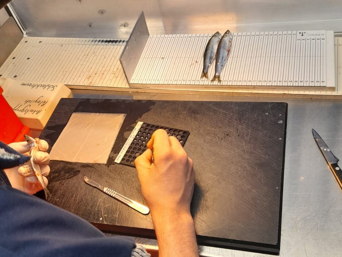 Pünktlich um 6 Uhr morgens kommen wir an unserem Startpunkt des heutigen Transektes an. Während unserer Sprotten-Akustikreise fahren wir täglich 70-90 Seemeilen lange Strecken, die sogenannten Transekte (Messpunkte entlang einer Linie). Ziel ist es, jedes statistische ICES-Rechteck (0,5 x 1 Grad, ca. 30 x 30 Seemeilen Fläche) mit 60 Seemeilen Transekt abzudecken. Wir dampfen dann mit 10 Knoten und schicken Echosignale im 38-kHz-Frequenzbereich in die Wassersäule. Wenn sich Fischschwärme in der Wassersäule befinden, bekommen wir ein Signal zurück. Um dann die Zusammensetzung der Schwärme zu bestimmen, fischen wir in regelmäßigen Abständen. In unserem Laborcontainer sortieren, messen und wiegen wir den Fang. Zusätzlich wird eine Unterprobe geschlachtet, bei der wir bei den Heringen und Sprotten Einzelgewichte, Geschlecht, Reifegrad und Magenfüllung aufnehmen, und feststellen, ob sie von Parasiten befallen sind. Wir entnehmen die Otolithen (Gehörsteine), damit Mario später im Institut das Alter der Fische bestimmen kann.