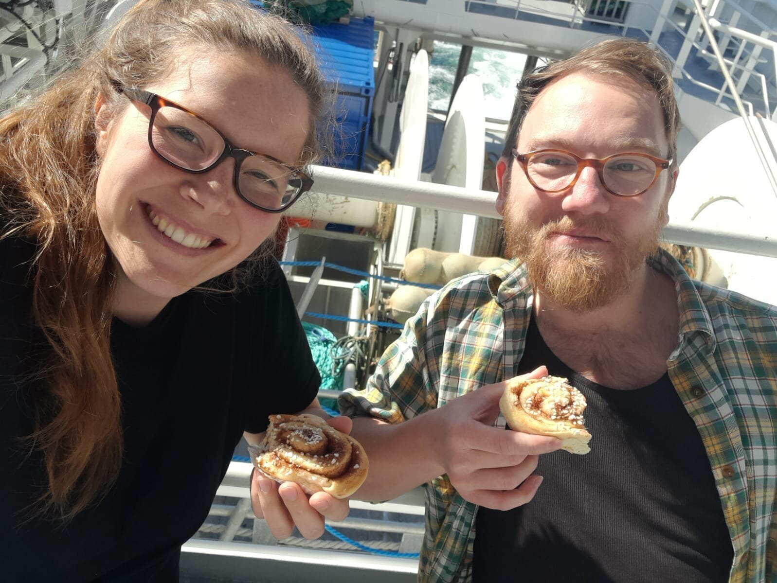 An Bord sind wir nur neun Personen. Dadurch ist die Atmosphäre sehr familiär. Wir essen zusammen und wir sitzen oft zusammen auf der Brücke und tauschen Geschichten aus der Fischerei und Wissenschaft aus. Abends schauen wir gemeinsam Fernsehen im „Wohnzimmer“. Da ist es praktisch, dass fast alle Filme auf Englisch und mit schwedischem Untertitel versehen sind.