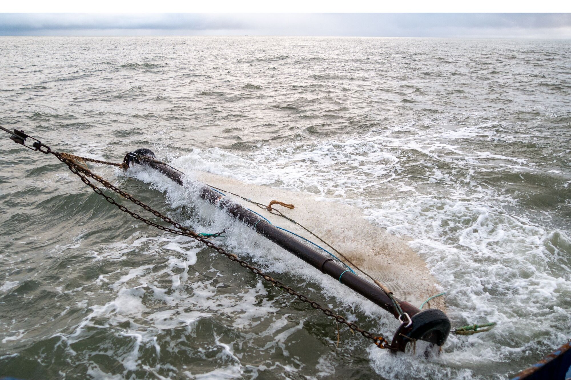 Auf unserer Reise kommen zwei neue Netze zum Einsatz. Frisch aus der Netzmacherei sind sie bereit nun endlich auf See benutzt zu werden. Wir fischen mit zwei Baumkurren, welche rechts und links vom Schiff an zwei Auslegern („Bäume“) befestigt werden. Noch sind die Netze strahlend weiß und sauber, aber das wird sich im Laufe der Reise schnell ändern.