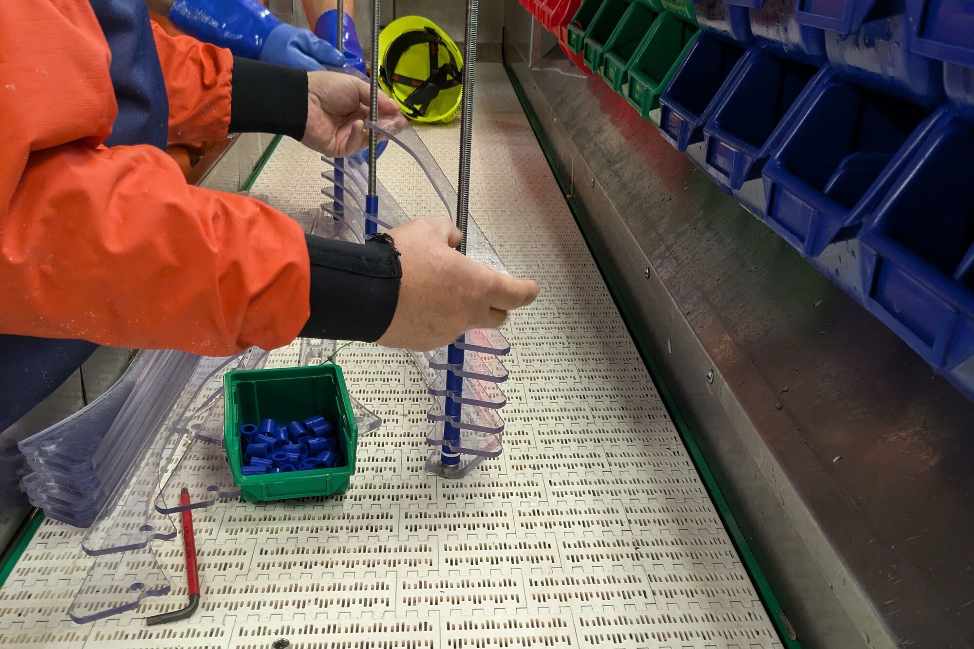 Das KingGrid funktioniert wie ein Bausatz. Dieser besteht aus einzelnen Teilen und kann beliebig zusammengesetzt werden. Wir erproben nicht nur das Gitter selbst im Gesamten, sondern testen auch unterschiedliche Konfigurationen: Die Gitterabstände können mit Abstandshaltern, sogenannten „Spacern“ verschieden eingestellt werden. Wir versuchen unter anderem, den besten Abstand zu finden, der sowohl den Fang der Zielart Nordseegarnele nicht beeinträchtigt, dabei aber so viel Beifang wie möglich aussortiert. Im ersten Teil der Reise haben wir mit 20mm Spacern begonnen, der größte in der Krabbenfischerei erlaubte Abstand der Gitterstreben in Sortiergittern. Nach erfolgreicher Erprobung wurde ein Gitter mit sehr kurzen Spacern – 12 mm – eingesetzt. Als letzten Teil des Experiments verwendeten wir Spacer mit 16 mm.