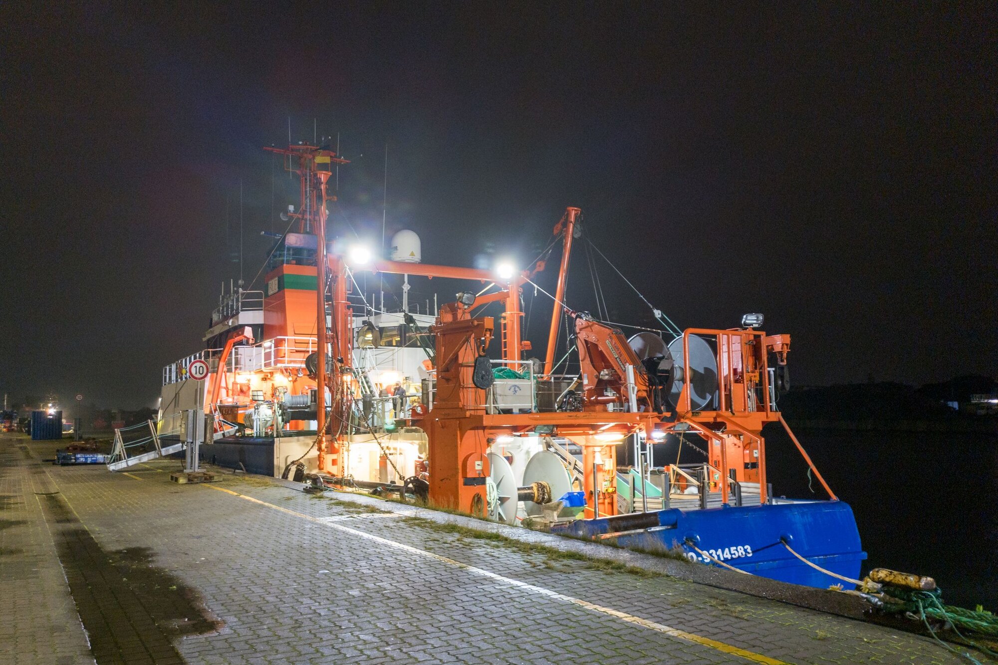 Während noch letzte Kontrollen und Vorbereitungen am Fanggeschirr und Netz an Land stattfinden, nutzen wir die Zeit und richten uns ein. Wir bereiten nicht nur unsere gemütlichen Kojen vor, sondern richten auch unseren Arbeitsplatz im Fischlabor her. Alle Kisten werden ausgepackt und anschließend sicher verstaut und das Ölzeug wartet schon sehnsüchtig auf den ersten Einsatz. Am Nachmittag verlassen wir Cuxhaven und machen uns auf den Weg! Endlich geht es los!