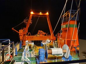Auf dieser Reise haben wir sogar nachts Plankton gefangen: Hier geht es uns um Fischlarven. Wir fangen sie mit einem großen Ringtrawl (MIK), das wir in einem V-Profil zwischen Oberfläche und Meeresgrund schleppen. Beschaffenheit des Netzes und der Fang bei Nacht erhöhen die Fängigkeit für die Fischlarven, auf die wir aus sind. Mit den MIK-Fängen tragen wir zu einem Projekt bei, in dem untersucht wird, wie die Ausdehnung der Aufwuchsgebiete von Sprotten und Sardinen von der Lage hydrographischer Fronten zwischen verschiedenen Wassermassen abhängen.