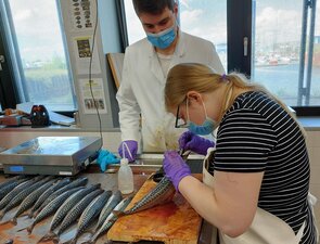 Theresa: Ich stehe hauptsächlich im Fischlabor, sortiere, bestimme. Vor allem kümmere ich mich um Haie, Rochen und andere lebende Fische, die wir wieder lebendig aussetzen können. Sonst mach ich wie andere auch Messarbeiten, Otolithen-Entnahme und ich friere die Proben ein, die Teil des Zusatzprogramms sind – beispielsweise für Praktika.