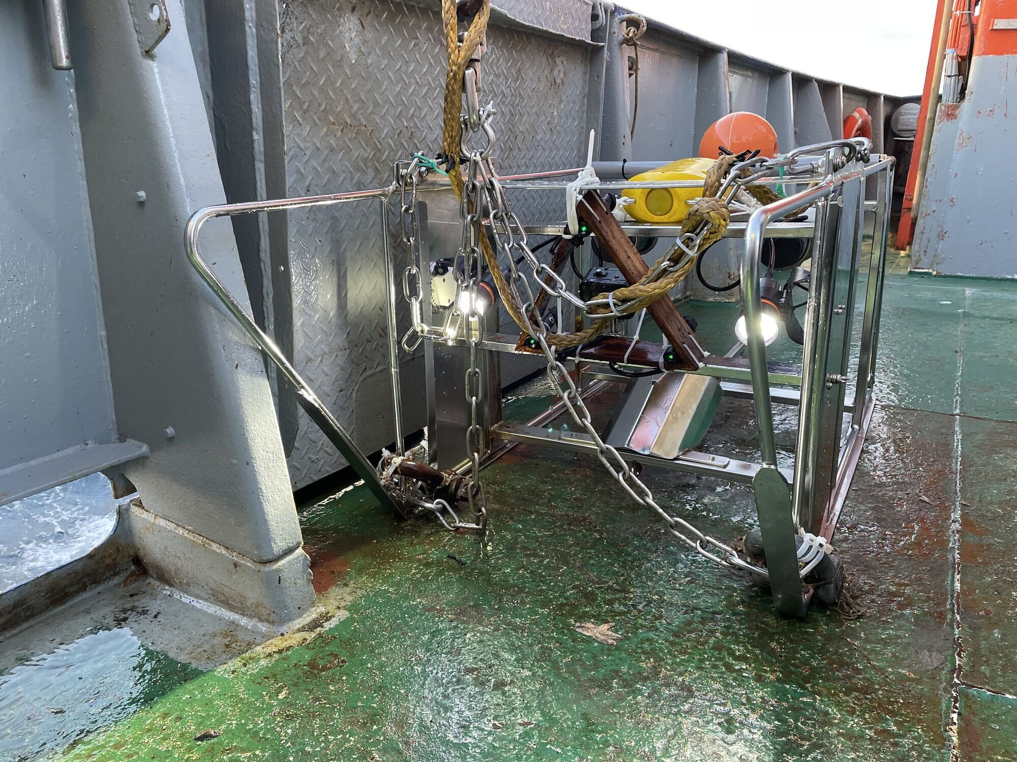 Aber bevor Verwirrung darüber aufkommt, ob dieser Schlitten etwas mit Weihnachten zu tun haben könnte, lasst mich erklären, um was es sich dabei handelt: Es ist ein schlittenähnliches Konstrukt, welches mit Scheinwerfern und einer GoPro-Kamera ausgestattet ist. Mit dem Kran wird es über die Bordwand gehievt und an einem Drahtseil über die Winde hinuntergelassen, bis es auf dem Meeresboden aufkommt. Es wird noch ein bisschen mehr Seil gegeben, so dass der Schlitten auf seinen Kufen hinter dem Schiff hergezogen werden kann. Kamera, Scheinwerfer und drei Laser zur Bestimmung der Distanzen sind nach vorne auf den Meeresgrund ausgerichtet. So ist der Schlitten pro Durchgang eine Stunde lang im Einsatz und filmt den vor uns liegenden Meeresgrund.