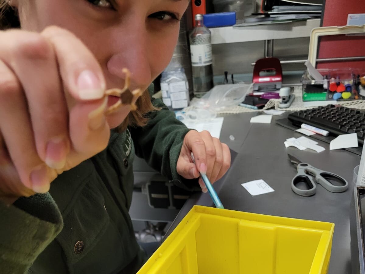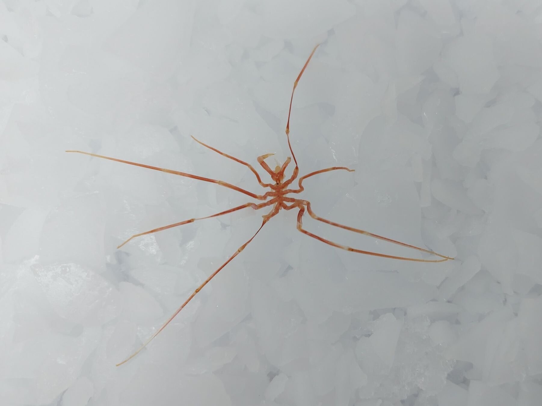 Wir verbringen die Zeit gerade viel im Schiff und sind seltener an Deck, deshalb nehmen wir euch heute nochmal mit ins Labor. Neben dem Fischlabor gibt es auch ein Chemielabor und hier habe ich, Lina, mich breitgemacht. Wer bei mir vorbeischaut, findet mich wohl oft rätselnd über einen Bewohner des Meeresbodens gebeugt. Ich kümmere mich um den Benthos-Beifang, also die am Boden lebenden Organismen. Bei mir landet erstmal alles auf dem Tisch, was kein Fisch ist: Seesterne, Seeigel, Schwämme und Korallen und dazu noch einige Kuriositäten wie Asselspinnen.