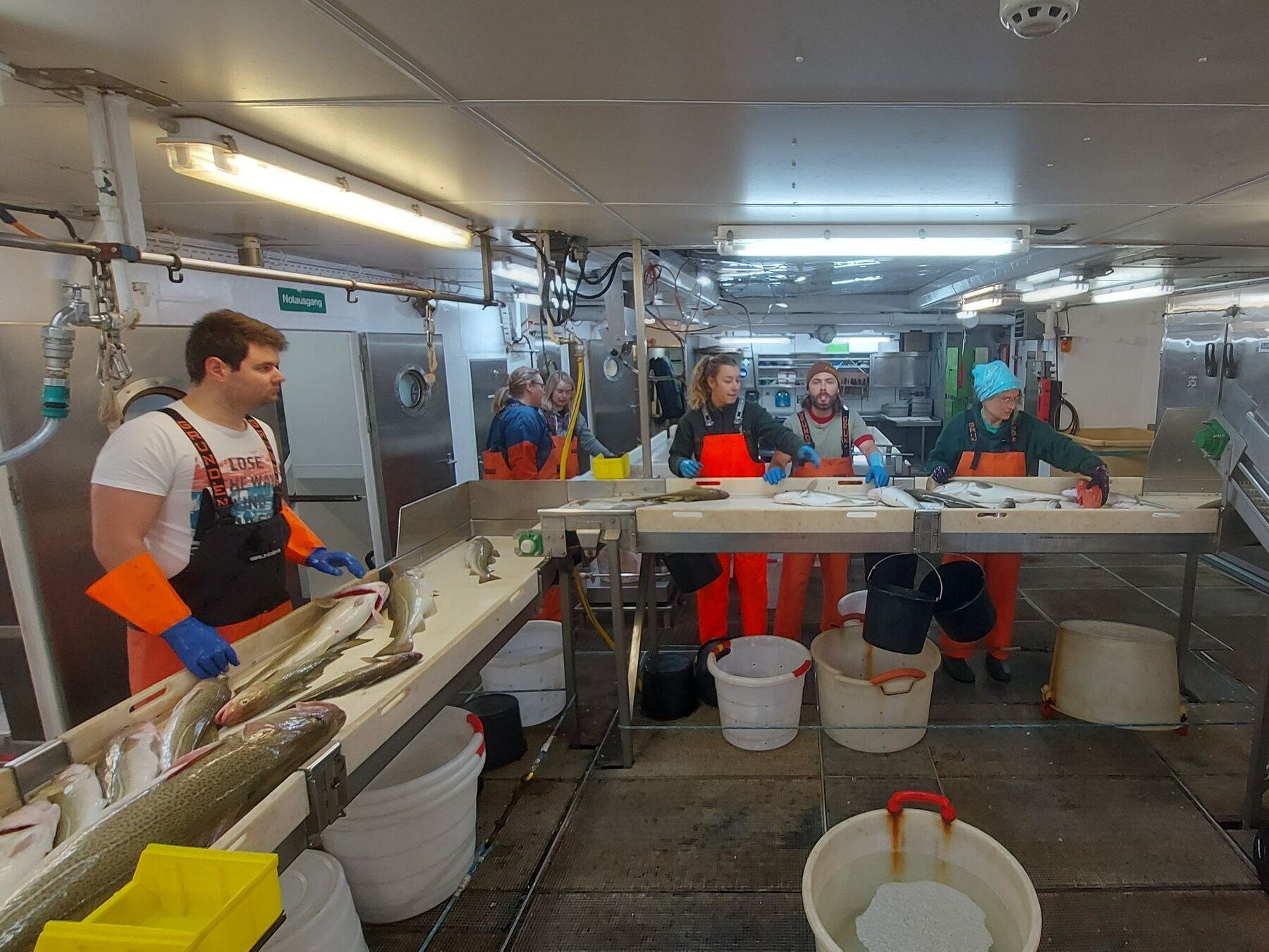 Je nach Größe des Fangs, kann die Aufarbeitung des Fangs ein paar Stunden dauern. Es ist immer eine große Überraschung, was im Netz ist, denn von einigen wenigen Fischen bis zum ganzen Schwarm kann alles dabei sein. Unsere Proben sammeln wir mit einem Grundschleppnetz, das immer für 30 Minuten an vorgegebenen Stationen über den Grund geführt wird. Dies bedeutet, dass wir nicht den Fisch suchen, sondern standortbezogen arbeiten, um die räumliche Verteilung der Arten repräsentativ abzudecken. Es geht uns ja nicht darum, viel Fisch an Bord zu holen, sondern die Ergebnisse unserer standardisierten Fänge im Anschluss zu nutzen, um Rückschlüsse auf die Gesamtgröße eines Bestandes zu ziehen. Damit wir möglichst wenig Fisch verschwenden, steht die Schiffsmannschaft schon bereit und filetiert die beprobten Fische.