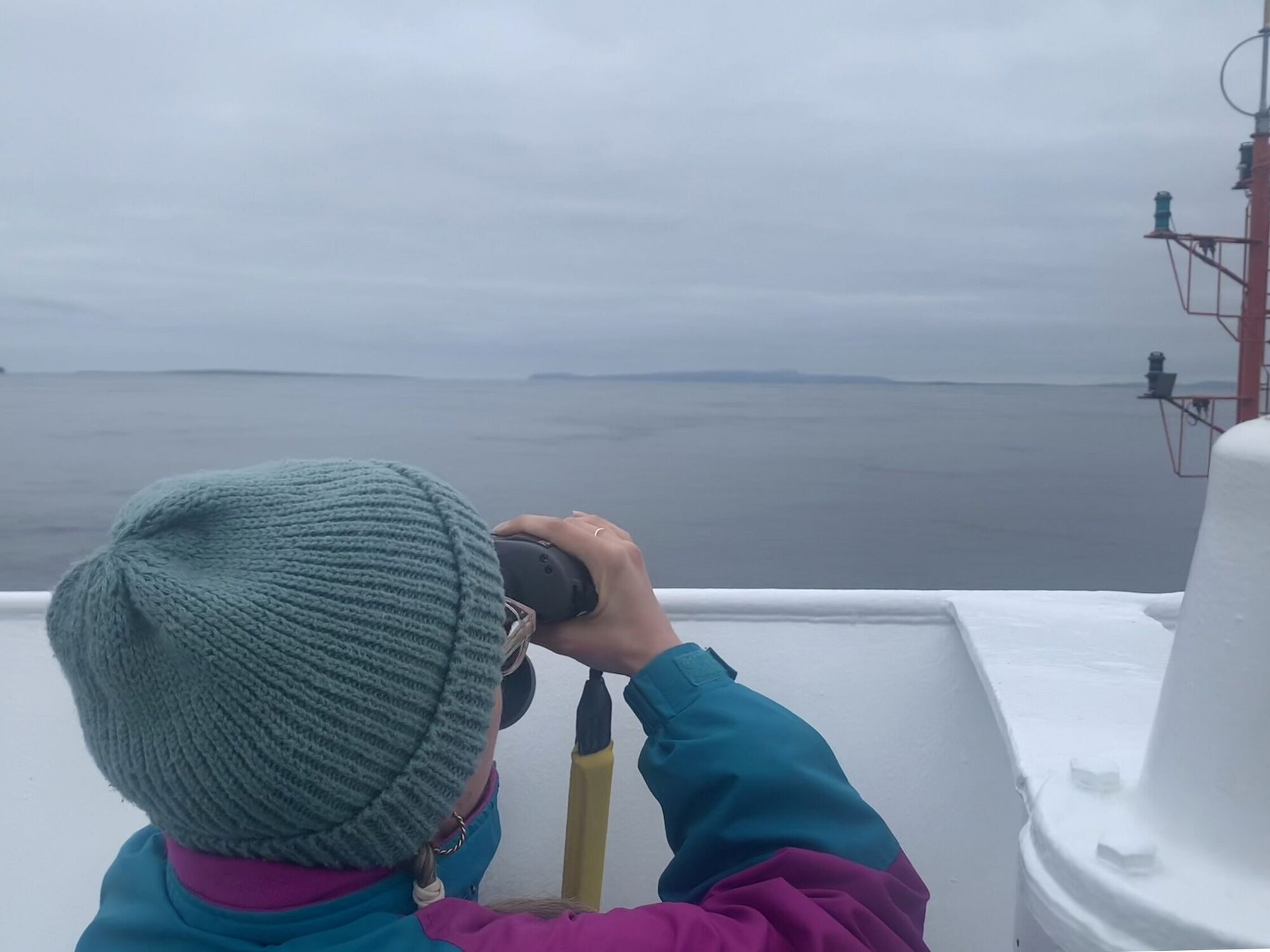 Die ersten Tage führen uns bei strahlend blauem Himmel quer über die Nordsee. Am 5. Juni fahren wir durch den Pentlands Firth, die Wasserstraße zwischen dem Festland Schottlands und den Orkney Inseln. Bekannt für die Gezeiten und dem starken Meereseinstrom, kann diese Engstelle vor allem bei Sturm sehr gefährlich werden. Wir haben Glück – das Wetter ist auf unserer Seite. Gegen den Strom haben wir allerdings an Geschwindigkeit verloren und kommen zunächst nur mit halber Kraft voran. Zum Glück erreichen wir schon bald unsere Reisegeschwindigkeit von 11 Knoten (knapp 20 km/h) und können weiter im Zeitplan bleiben. Noch ein kurzer Blick auf Schottland, dann geht es endlich in den Nordatlantik. Einschaukeln ist angesagt: Wir gewöhnen uns langsam an den Seegang. Dieses Jahr ist die See uns allerdings gnädig und gewährt uns einen sanften Einstieg. Der beste Platz bei Sonnenschein ist das Peildeck über der Brücke. Mit Ferngläsern bewaffnet lassen sich von hier immer Tiere beobachten.