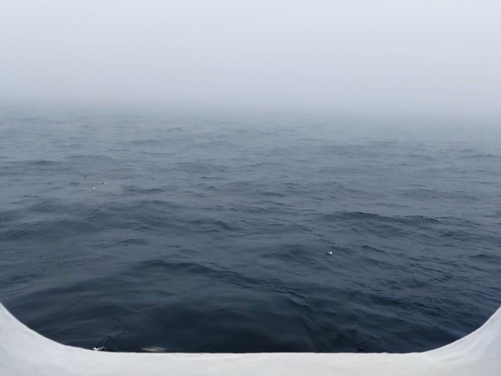 Eine weiße Wand – seit zwei Tagen hängen wir im Nebel, die Wolkenuntergrenze liegt bei 0 Metern und die Sichtweite ist dementsprechend schlecht. Ruhige See und kaum Wind bedeutet nun mal auch, dass nichts die Wolken wegschieben kann. Wenn wir dampfen, dann nicht mit voller Geschwindigkeit, damit die Brücke schnell auf Eisberge reagieren kann. Schiffsnavigation unter diesen Bedingungen ist eine Herausforderung und erfordert höchste Konzentration, eine Anstrengung für die Offiziere. Arbeiten können wir trotzdem, denn den Fischen ist der Nebel egal.