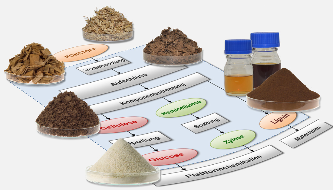 Aus unseren land- und forstwirtschaftlichen Roh- und Reststoffen (Stroh, Ernterückstände, Waldholz, Kurzumtriebs- und Schwachholz, Rinde) können nahezu alle chemischen Produkte hergestellt werden, die heute auf fossilen Rohstoffen basieren. In Bioraffinerien – Anlagen zur Umwandlung der nachwachsenden Rohstoffe in chemische Produkte – laufen diese Prozesse stufenweise in zum Teil hochintegrierten Verfahren ab.