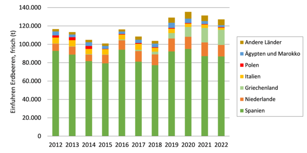 Deutschland ist Netto-Importeur von frischen Erdbeeren, da größere Mengen an frischen Erdbeeren importiert als exportiert werden. Die Einfuhren schwanken zwischen den Jahren. In 2023 wurden 114.000 Tonnen frische Erdbeeren importiert. Zwei Drittel der eingeführten frischen Erdbeeren kommen aus Spanien. Weitere wichtige europäische Lieferländer für frische Erdbeeren sind die Niederlande, Griechenland und Italien. Dabei ist die Importmenge von Erdbeeren aus Griechenland in den letzten vier Jahren deutlich angestiegen. Außereuropäische Importe, z. B. aus Ägypten und Marokko spielen mit nur 3 % eine untergeordnete Rolle.