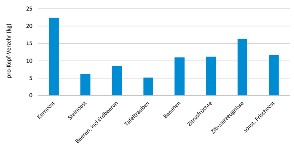 Rund 97,5 Kilogramm Obst verzehrt jede/r Deutsche im Jahr 2022/23. Das sind 2,3 kg weniger als im Vorjahr. Über die Hälfte des Obstverbrauches entfällt auf Arten, die in Deutschland nicht angebaut werden können: Zitrusfrüchte und Bananen stellen bereits 42 % des Obstverbrauches dar. Am meisten verzehrt wird Kernobst wie Äpfel oder Birnen mit 22,5 Kilogramm pro Kopf. Der jährliche Bananenkonsum beläuft sich auf 11 Kilogramm wie bereits im Vorjahr. Die anderen Obstarten sind mengenmäßig deutlich weniger bedeutsam, da sie vorwiegend saisonal nachgefragt werden; Steinobst, Erdbeeren, Strauchbeeren, Tafeltrauben und sonstiges Frischobst (vorwiegend exotische Südfrüchte) kommen zusammen auf rund 34 Kilogramm pro Jahr.