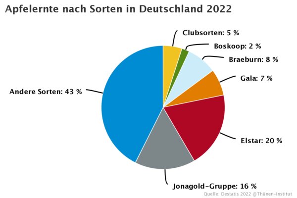 Die Sorte Elstar und die Gruppe der Jonagold-Sorten machen gemeinsam rund ein Drittel der Apfelernte aus und zählen damit zu den wichtigsten Sorten in Deutschland. Auch Braeburn, Gala und Boskoop spielen eine wichtige Rolle im heimischen Obstbau (Abb. 6, Steckbrief Apfel). Insgesamt wird eine sehr große Sortenvielfalt an Äpfeln kultiviert, die Anbaustatistik weist 83 verschiedene Sorten aus.